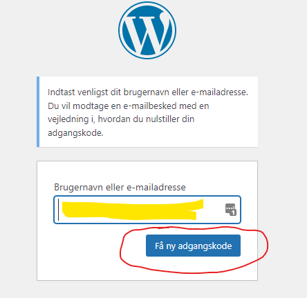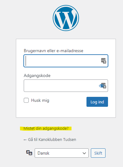 Når du har klikket på menupunktet, så kommer du frem til en login skærm. Har du din email adresse og dit kodeord …. ja så logger du ind, men ellers kan du klikke på det med gult markerede link for at nulstille dit kodeord.